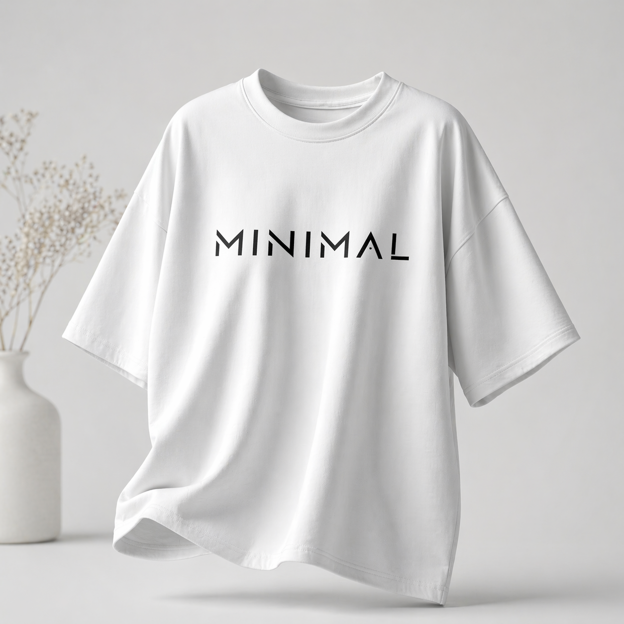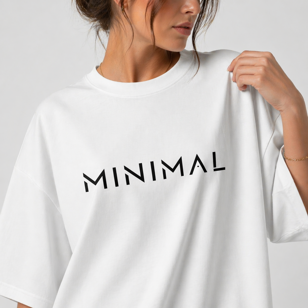 Using 100% breathable cotton, we’ve selected a 180 GSM weight to ensure the fabric hangs perfectly, providing that sought-after “structured” look that masks creases and maintains its form. The centerpiece is our signature “MINIMAL” graphic, printed in a sharp, geometric font that adds an edgy, architectural touch to a classic white tee.