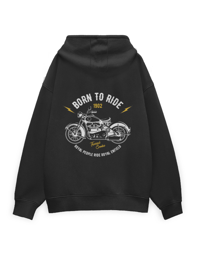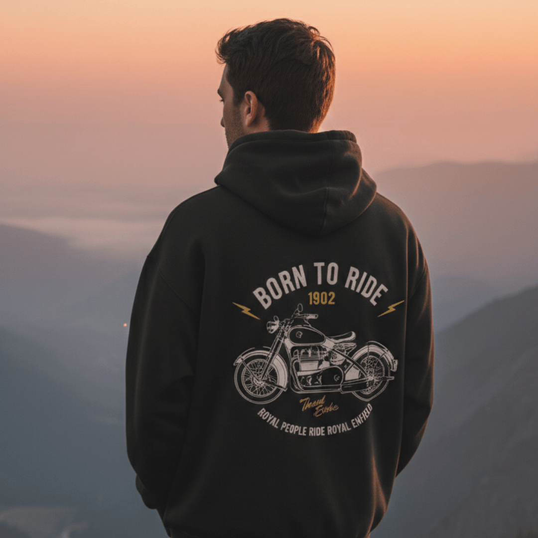 Embrace the spirit of the ride with the Thread Evoke Vintage Biker Hoodie. This isn’t just a piece of clothing; it’s a tribute to a century of motorcycling excellence. The back features a detailed vintage motorcycle illustration, flanked by the iconic “Born to Ride” slogan and a nod to the legendary Royal Enfield heritage.