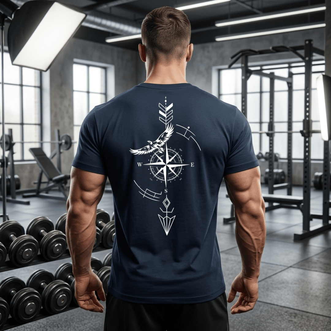 Introducing the “White Compass and Eagle Design” t-shirt, a premium piece of apparel meticulously designed for the modern man who values both sophisticated design and uncompromised comfort. This exclusive graphic tee is more than just a clothing item; it’s a symbol. The central compass signifies purpose and guidance, while the soaring eagle represents freedom, vision, and strength—together, they chart a course for your personal journey, both inside and outside the gym.