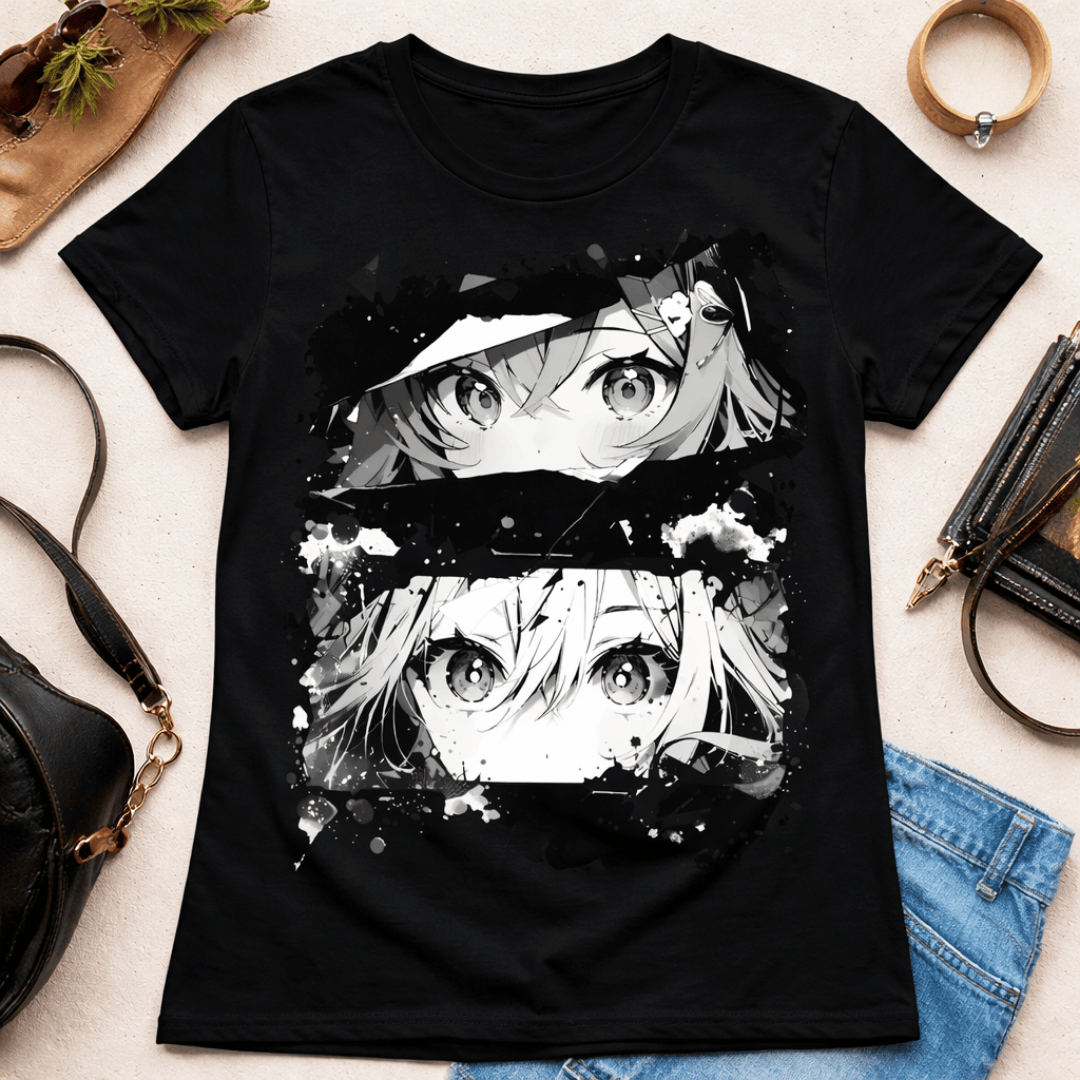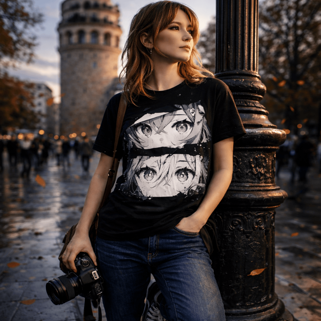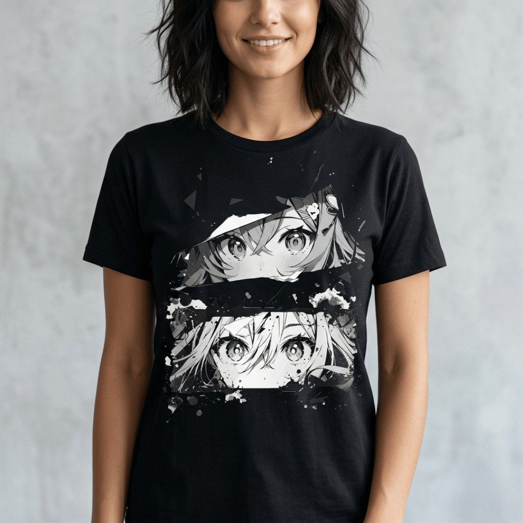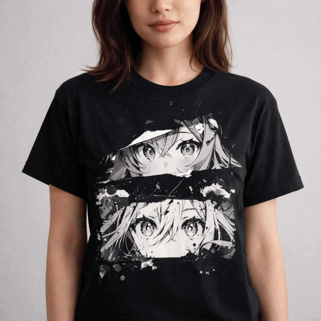 The design features two tiers of piercing anime eyes, rendered in a crisp monochrome palette that pops against the deep black fabric. Whether you’re heading to a convention, hanging with friends, or just leveling up your casual look, this tee provides the perfect balance of “otaku” culture and modern fashion.